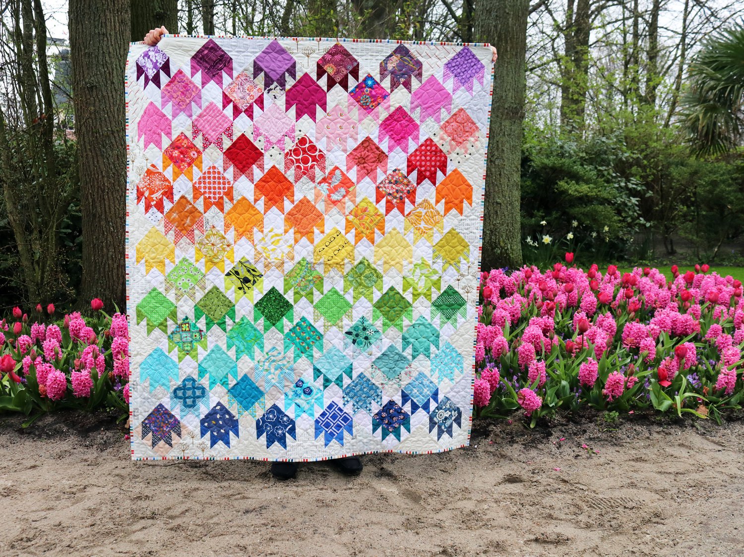 I made some extra blocks to fill out the rainbow and assembled the blocks last month. Now she is finished with looping continuous eight quilting, a soft contrast for all those pointy bear paw blocks. The quilt is bound in a rainbow striped fabric from The Confident Stitch. I actually was not thinking of binding when I added that fabric to my stash last year, but it is actually perfect as binding on a rainbow scrap quilt! I’m tempted to buy more.