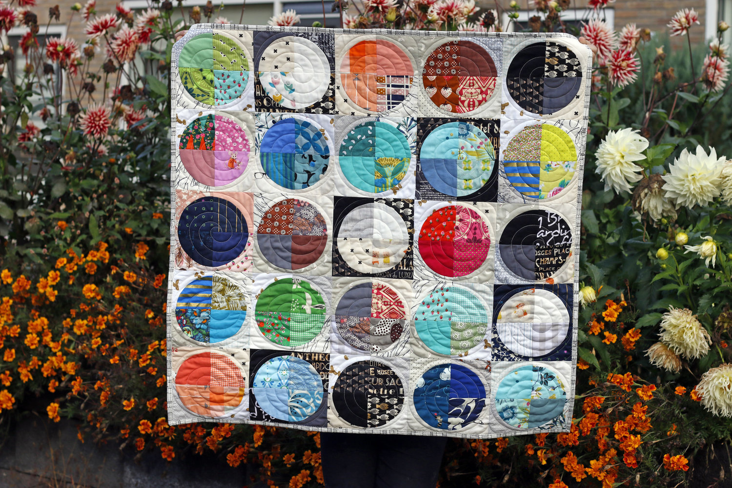 This weekend I finished my baby-sized Dear Dottie quilt. It’s a 32” square of scrap happy dots with cinnamon roll swirl quilting. Fun, fun, fun!
