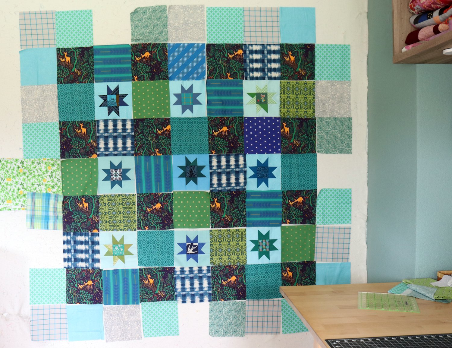 Now that I am finished with my wonky star blocks, I can work out a design for this picnic blanket on my design wall.