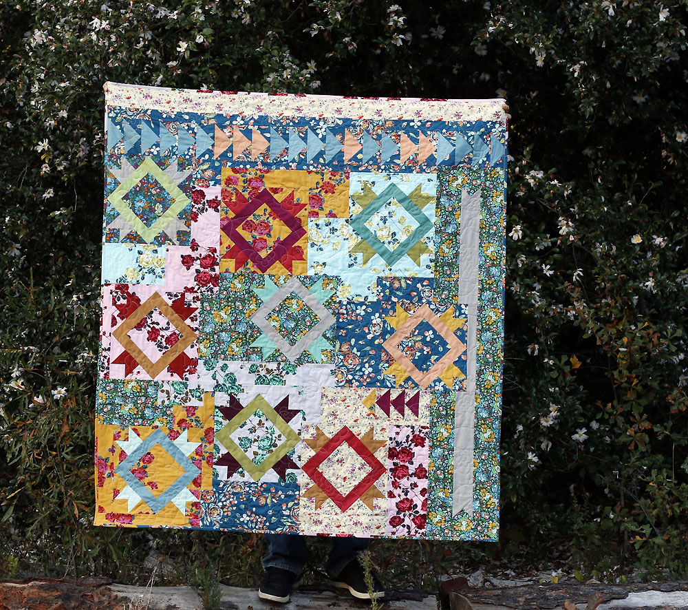 In the finished setting, the background prints spill out from the blocks to fill the spaces between. The improv required to create this effect is a type of patchwork I relish. The finished quilt is exuberantly floral, more delightful than I could have ever sketched or pre-imagined. How lucky that our giant camilia bush is blooming at this very moment! I love how its blooming beauty fills the space around the quilt in these photographs.