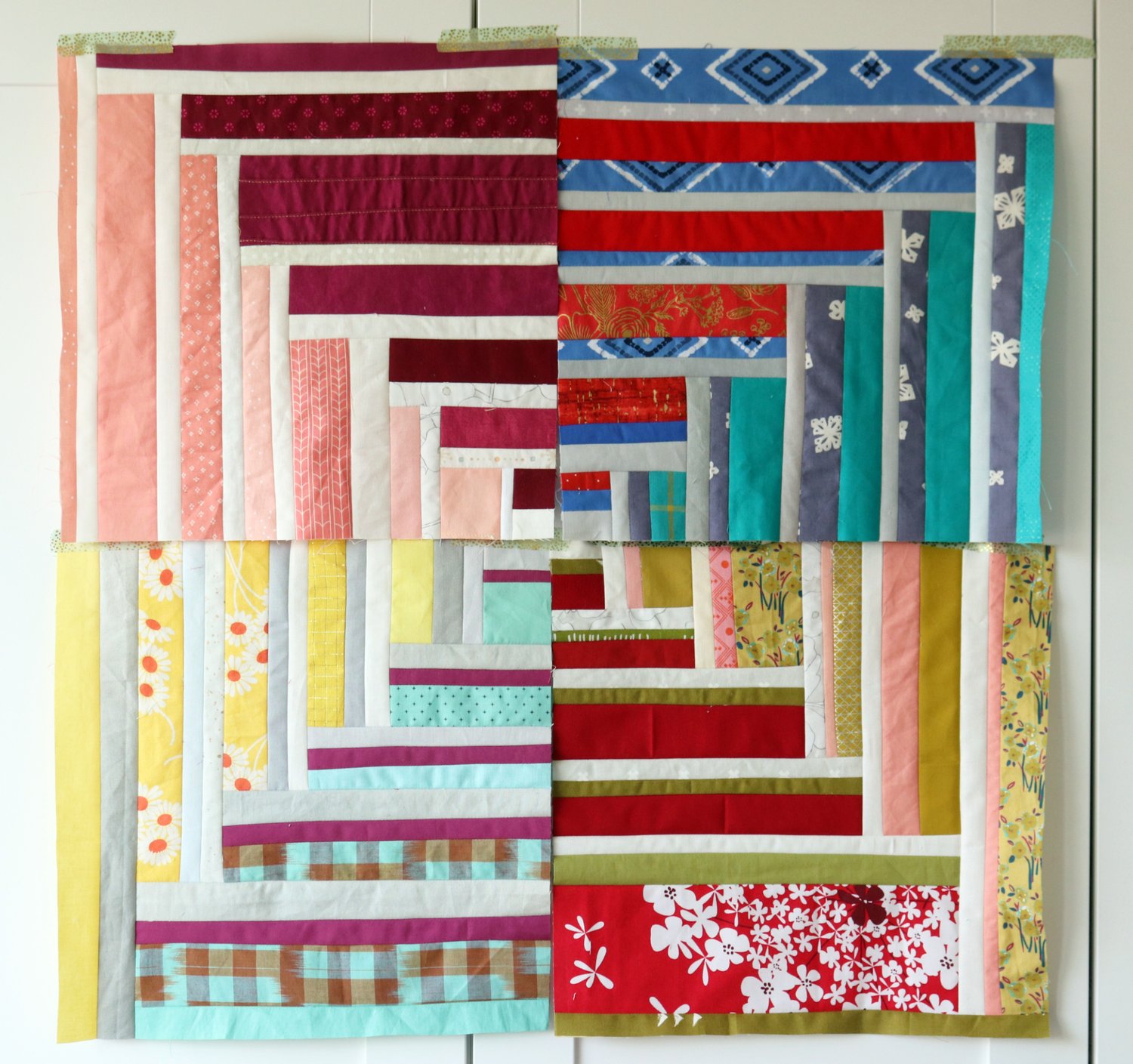 Getting started is always tricky because it’s hard for me to see how to orient the stripes in the beginning. Once I get started, the logs build upon each other quite logically. I have decided not to make the logs a regular width, because I like to use my scraps without excessive trimming. When the width of the scraps sets the width of each log, a pleasant variation arises and the fabric is used most efficiently.