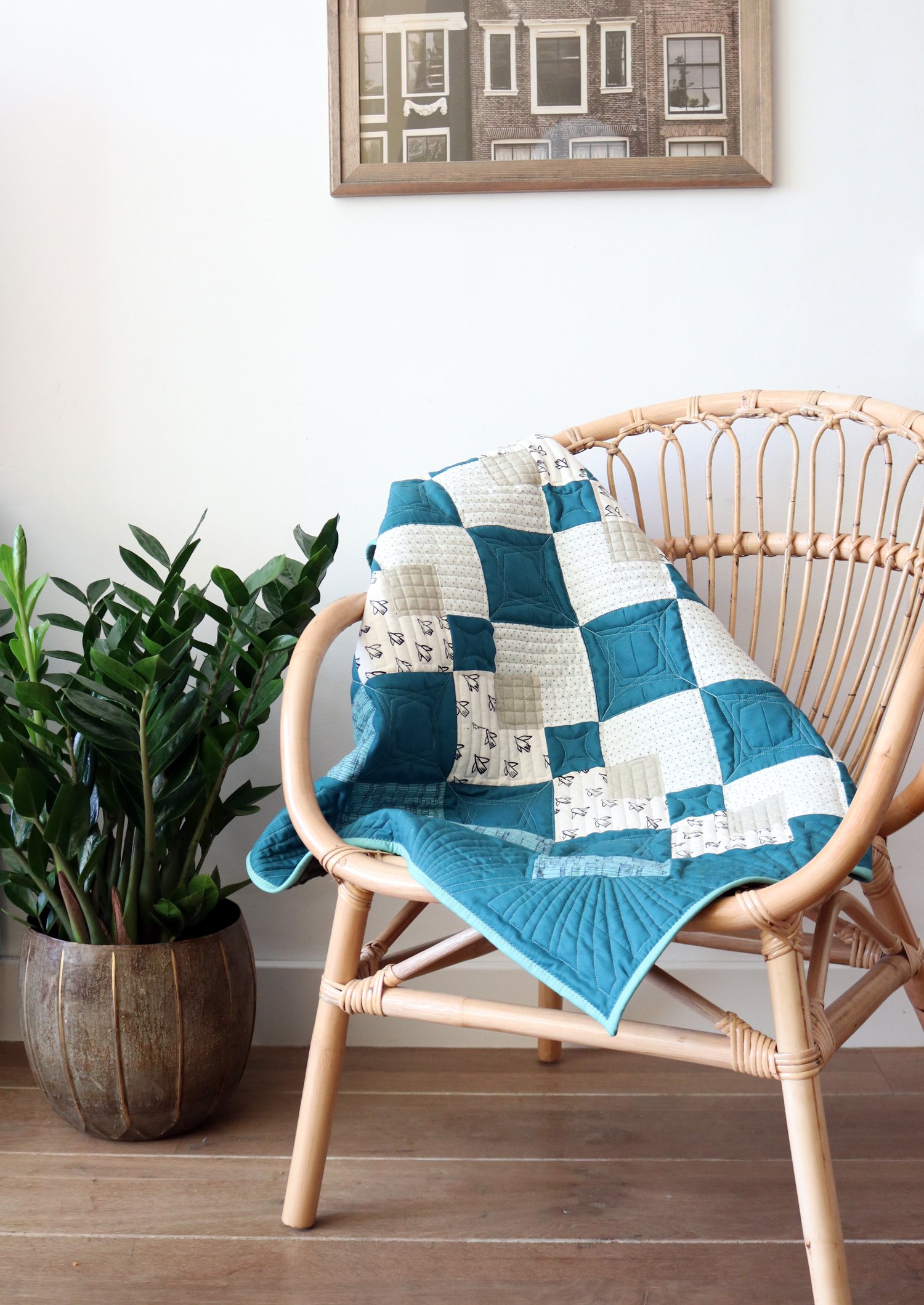 This baby quilt is custom quilted. To emphasize the overlapping “transparency” squares I quilted straight lines in the cream squares. Where the cream squares overlap, a pretty grid forms. For the rich teal areas, I chose simple, yet elegant designs, but that’s probably where it got too fussy. Maybe a combination of custom quilting for the cream squares and hand tying for the teal areas would have been better.