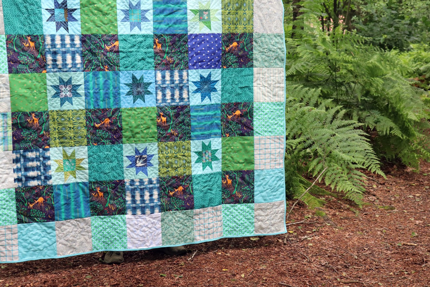 She’s finished with solid aqua binding and that Growing Tree wideback fabric from Dragonfly Quiltworks.